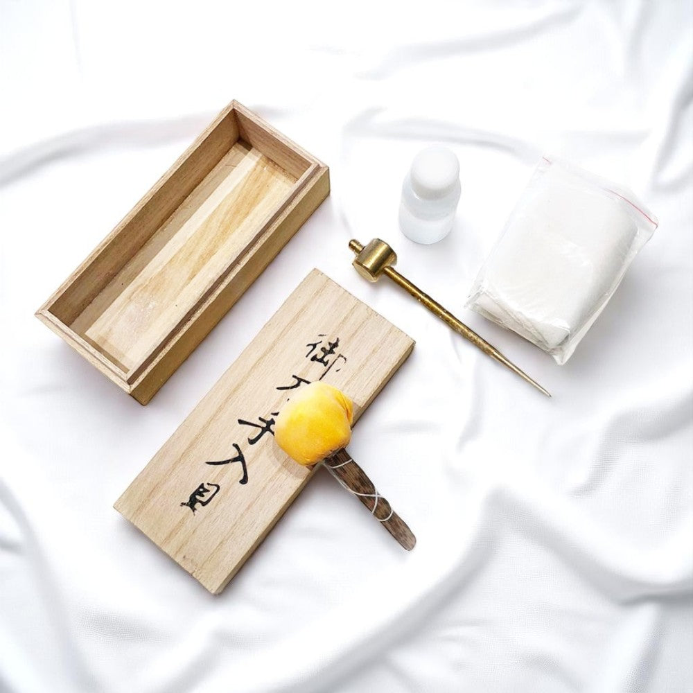 A must-have for all serious collectors. Please note that cleaning kits shipped by EMS or UPS cannot contain choji oil, as this liquid is forbidden for air transport. The choji oil is replaced by a whetstone.